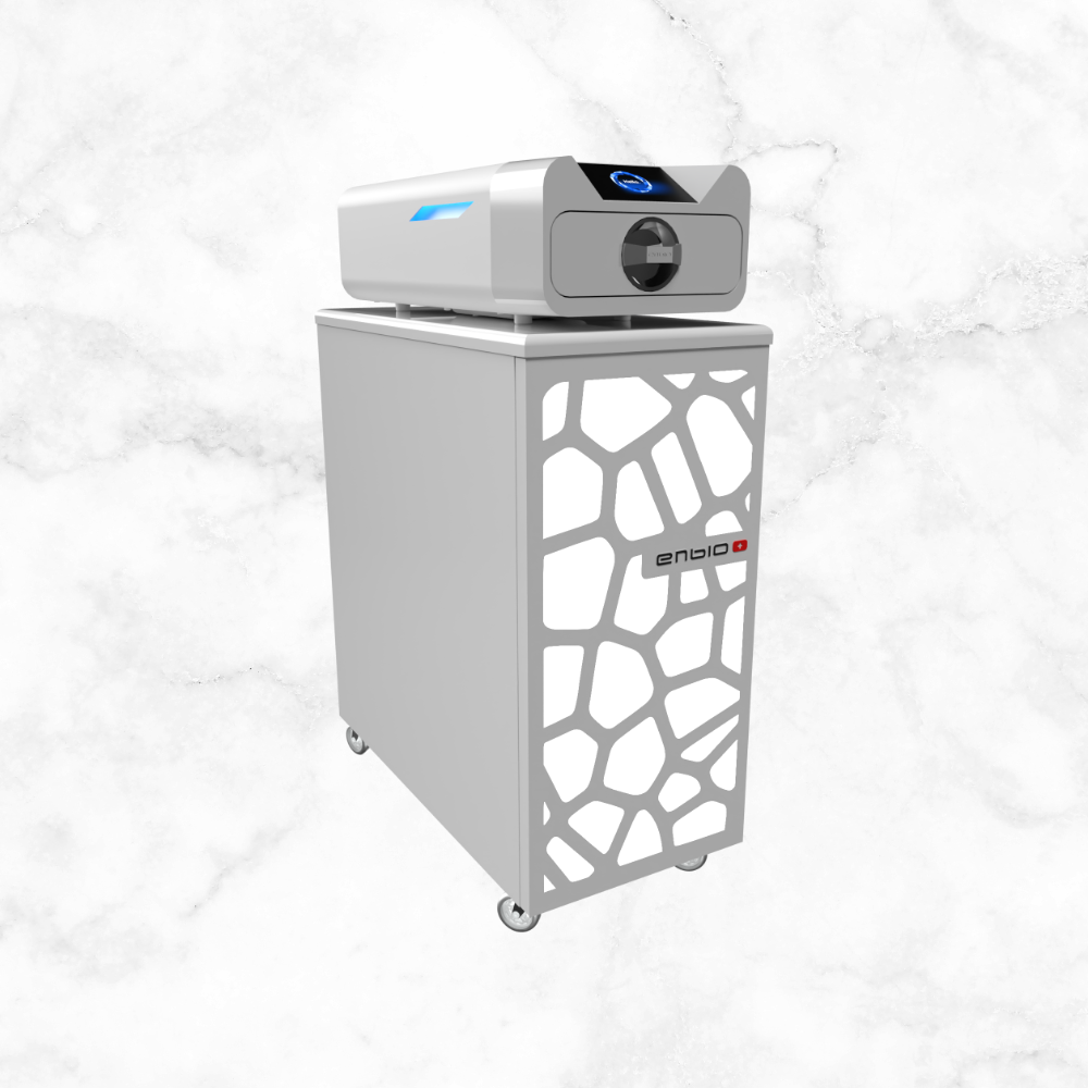A superbly made bespoke trolley/cabinet for your Enbio autoclave. The Enbio sits pride of place on top of the unit which has incredibly useful storage shelves underneath and a perfectly sized storage compartment on the back for your water bottles.