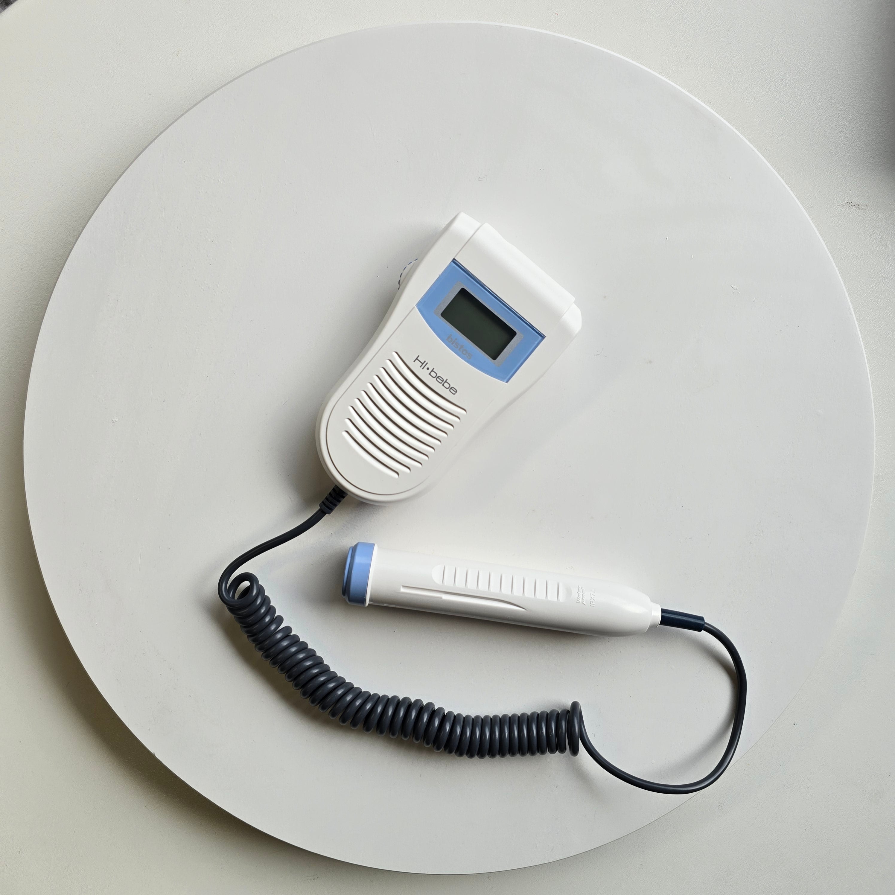 Professional fetal doppler from Bistos. It runs at 2MHz and comes with an interchangeable doppler (hand piece) if needed, 2 x AA batteries, storage pouch and ultrasound gel. Has optional audio jack for use with headphones and operation manual also included. Made in Korea.
